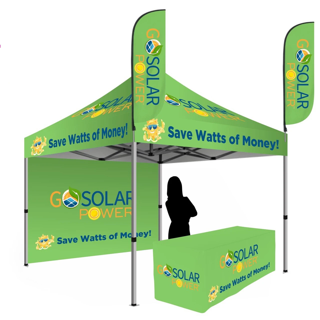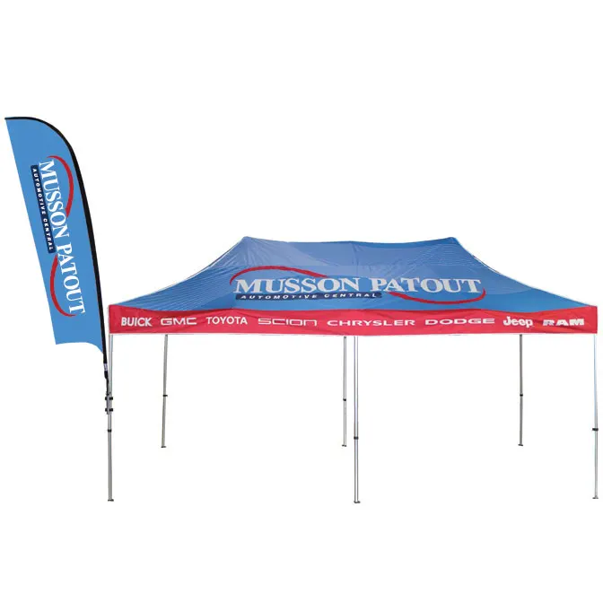 10' Canopy Tents feature a lightweight aluminum frame that is durable and easy to set up, although it does require two people. The frame features hexagonal legs for extra strength compared with standard square shaped legs. Custom printed canopy tops are digitally printed in full color on 6.5 oz outdoor canvas. Full back and side walls, and half walls are also available to provide protection from the wind, or to give you additional places to display logos and messages.